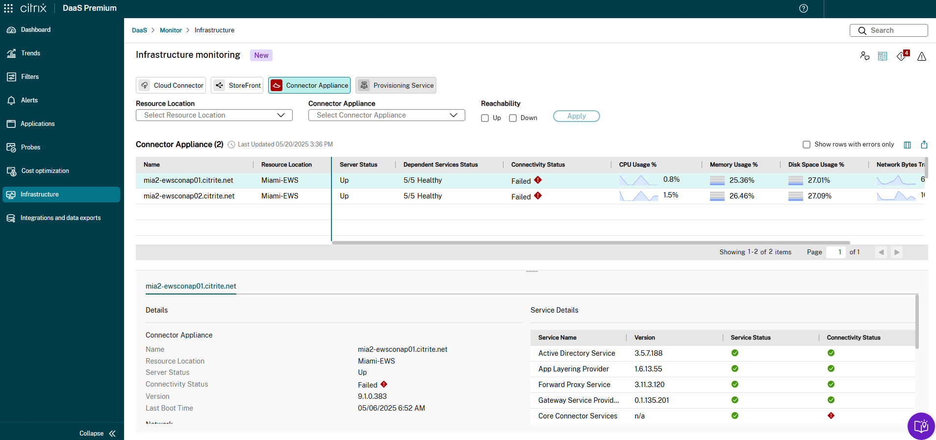 This feature enables customers to monitor Connector Appliance’s health under the Infrastructure monitoring dashboard.